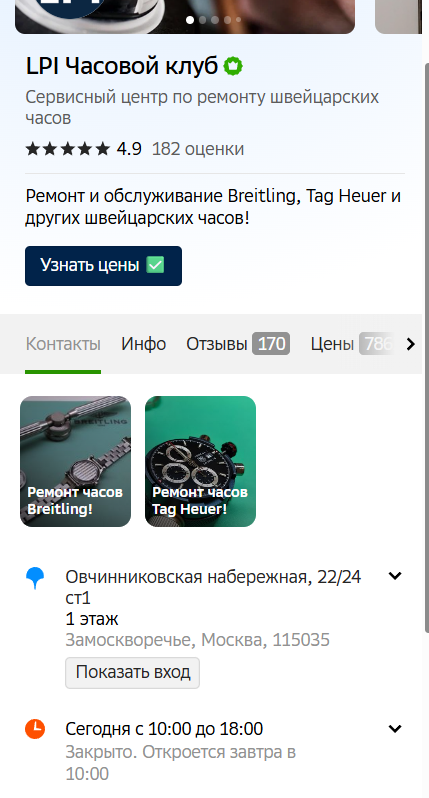 К нам обратилась компания, занимающаяся ремонтом часов. После проведения бесплатного гео-аудита мы выявили проблему: карточка компании в 2ГИС была неоформленной и не вызывала доверия у потенциальных клиентов.